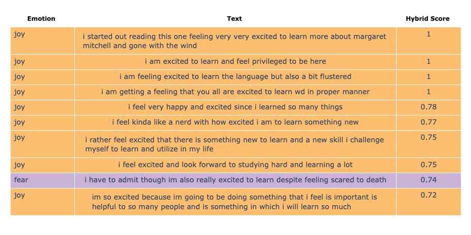 For example, getting the texts and their emotion label containing the phrase excited to learn is a matter of applying filter on the relation defined above: